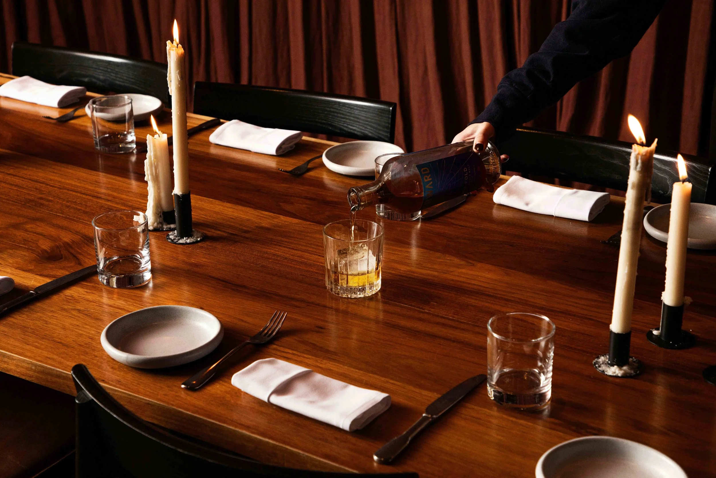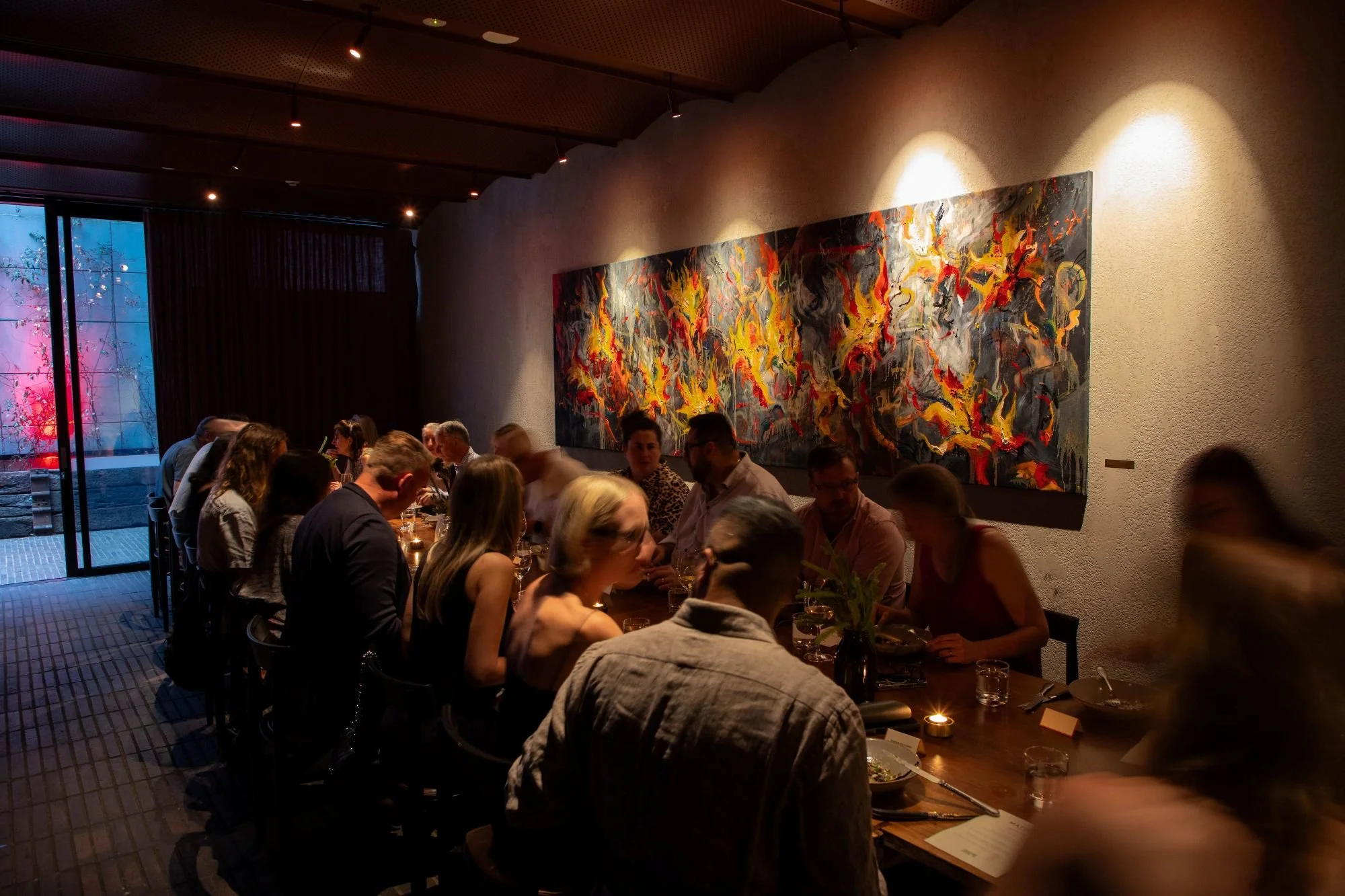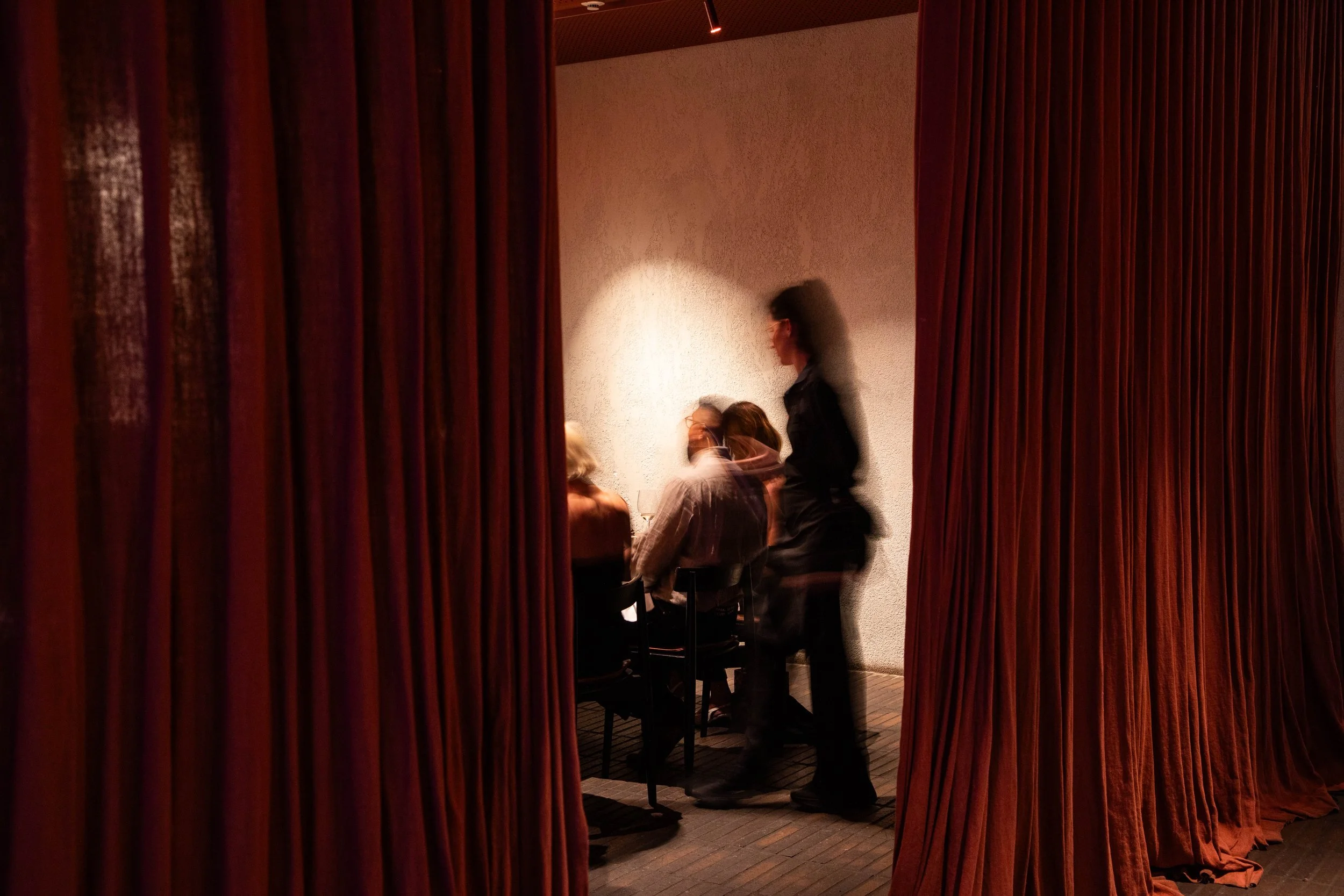 Featuring handcrafted timber and earthy tones reflecting Matilda's connection to fire and nature. Separated by elegant terracotta curtains for flexible semi-private dining.